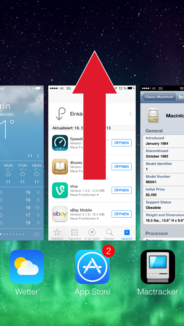 1. Doppelt auf den Home-Button drücken. Die Multitasking-Ansicht öffnet sich.