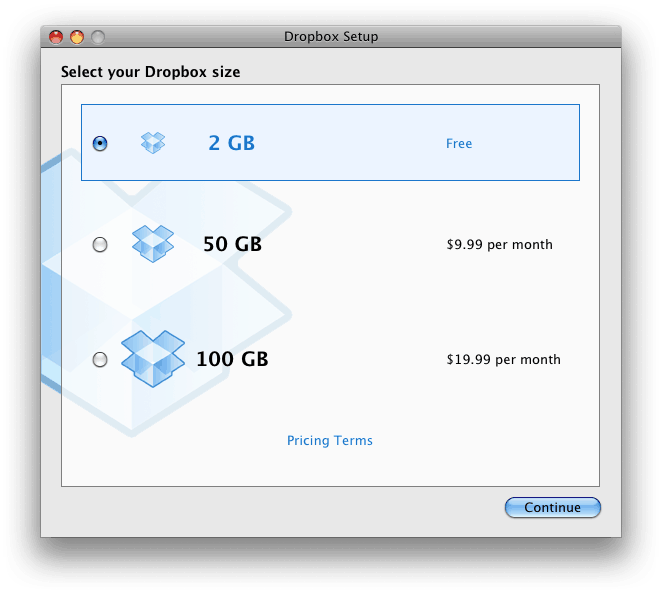 5. Im folgenden Fenster wählen Sie aus, welche größe Ihre Dropbox haben soll. Die 2 GB Version ist kostenlos, alle weiteren Kostenpflichtig. Bestätigen mit Continue.